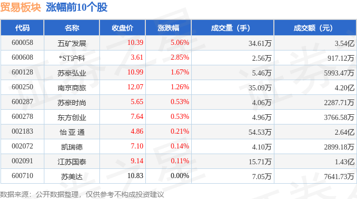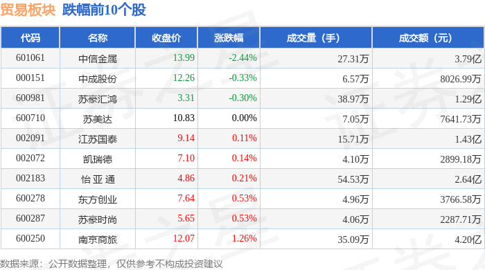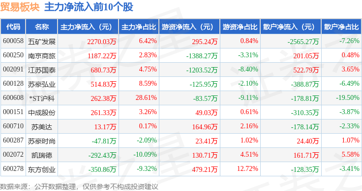从资金流向上来看,当日贸易板块主力资金净流出224.03万元,游资资金净流出1595.79万元,散户资金净流入1819.82万元。贸易板块个股资金流向见下表: