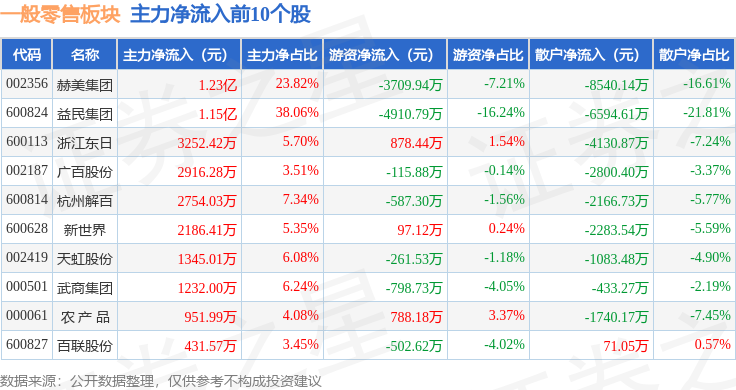 从资金流向上来看,当日一般零售板块主力资金净流出19.16亿元,游资资金净流出1.66亿元,散户资金净流入20.82亿元。一般零售板块个股资金流向见下表: