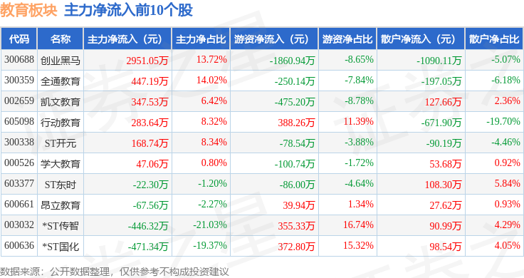 从资金流向上来看,当日教育板块主力资金净流出1.47亿元,游资资金净流入2248.4万元,散户资金净流入1.24亿元。教育板块个股资金流向见下表: