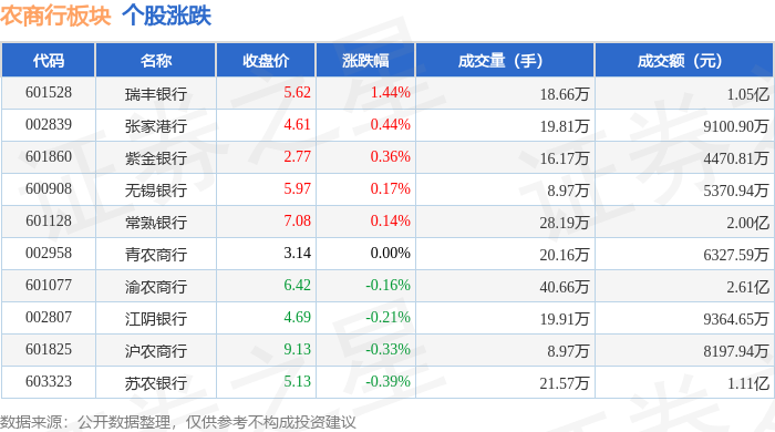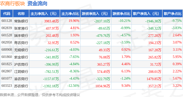 从资金流向上来看,当日农商行板块主力资金净流入369.63万元,游资资金净流出1056.34万元,散户资金净流入686.71万元。农商行板块个股资金流向见下表: