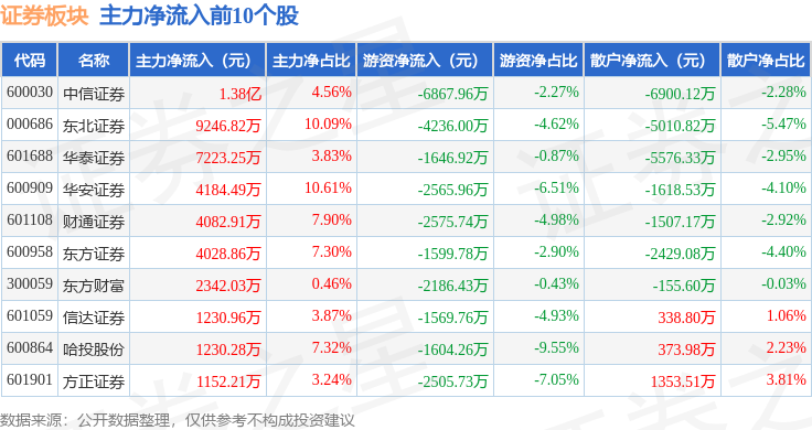 从资金流向上来看,当日证券板块主力资金净流出6.66亿元,游资资金净流出1.43亿元,散户资金净流入8.09亿元。证券板块个股资金流向见下表:
