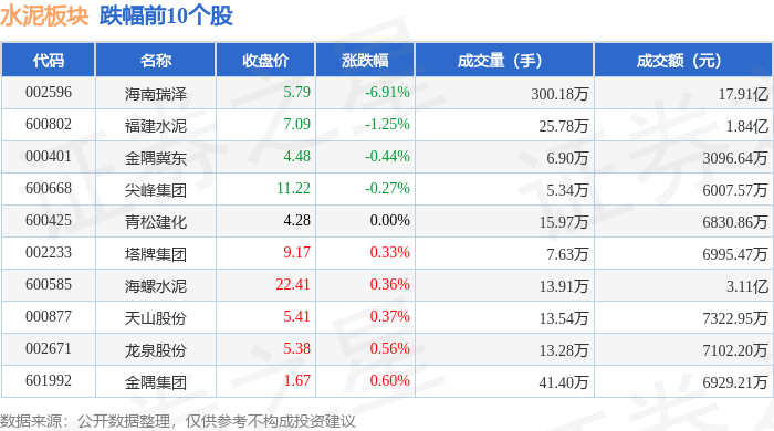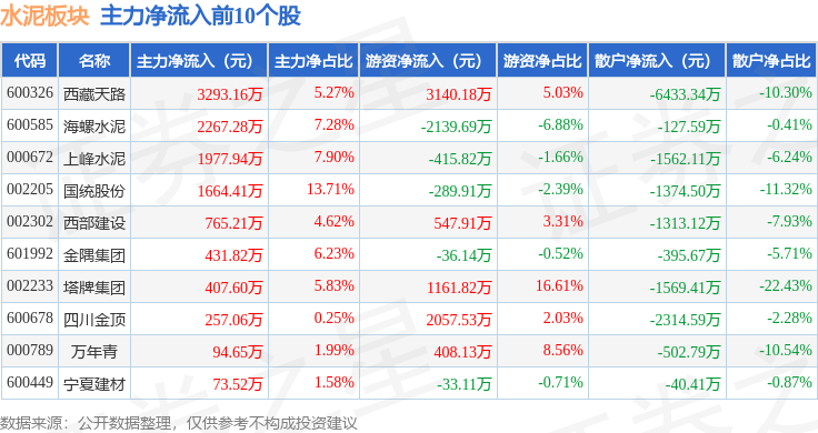 从资金流向上来看,当日水泥板块主力资金净流出7351.43万元,游资资金净流入504.98万元,散户资金净流入6846.45万元。水泥板块个股资金流向见下表:
