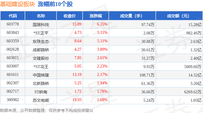 证券之星消息,12月25日基础建设板块较上一交易日上涨0.45%,国晟科技领涨。当日上证指数报收于3959.62,上涨0.47%。深证成指报收于13531.41,上涨0.33%。基础建设板块个股涨跌见下表: