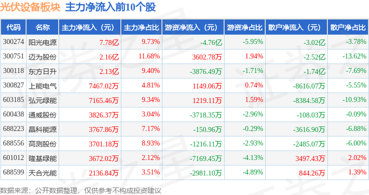 从资金流向上来看,当日光伏设备板块主力资金净流入6.76亿元,游资资金净流出2.44亿元,散户资金净流出4.32亿元。光伏设备板块个股资金流向见下表: