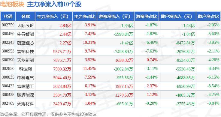 从资金流向上来看,当日电池板块主力资金净流出9.37亿元,游资资金净流出3.05亿元,散户资金净流入12.43亿元。电池板块个股资金流向见下表: