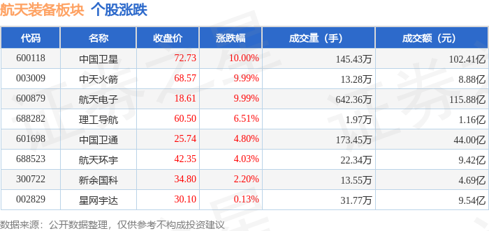 证券之星消息,12月25日航天装备板块较上一交易日上涨7.42%,中国卫星领涨。当日上证指数报收于3959.62,上涨0.47%。深证成指报收于13531.41,上涨0.33%。航天装备板块个股涨跌见下表:
