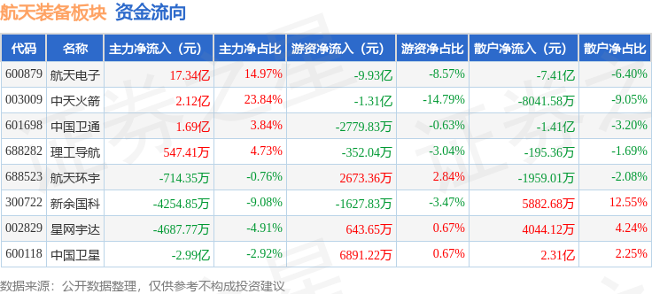 从资金流向上来看,当日航天装备板块主力资金净流入17.24亿元,游资资金净流出10.7亿元,散户资金净流出6.54亿元。航天装备板块个股资金流向见下表: