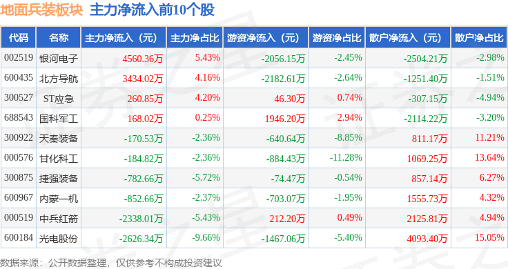 从资金流向上来看,当日地面兵装板块主力资金净流出6811.5万元,游资资金净流出5299.4万元,散户资金净流入1.21亿元。地面兵装板块个股资金流向见下表: