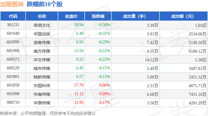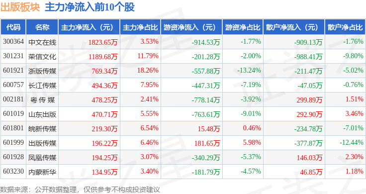 从资金流向上来看,当日出版板块主力资金净流出2349.88万元,游资资金净流出2301.79万元,散户资金净流入4651.67万元。出版板块个股资金流向见下表: