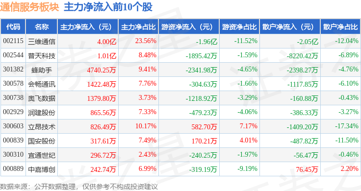 从资金流向上来看,当日通信服务板块主力资金净流出1867.54万元,游资资金净流出1.83亿元,散户资金净流入2.02亿元。通信服务板块个股资金流向见下表: