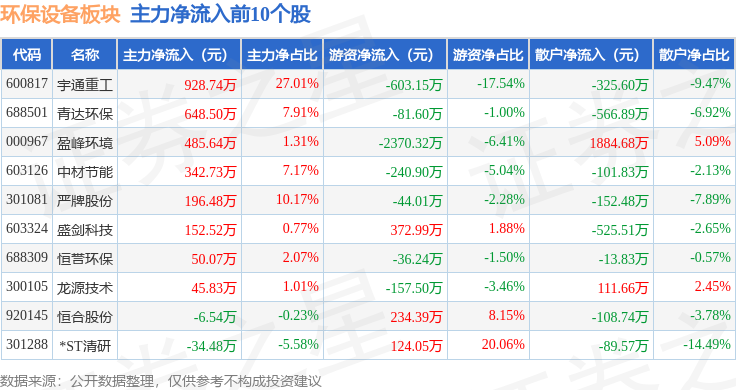 从资金流向上来看,当日环保设备板块主力资金净流出4.78亿元,游资资金净流入1.05亿元,散户资金净流入3.72亿元。环保设备板块个股资金流向见下表: