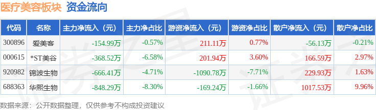 从资金流向上来看,当日医疗美容板块主力资金净流出1371.8万元,游资资金净流入243.81万元,散户资金净流入1127.99万元。医疗美容板块个股资金流向见下表: