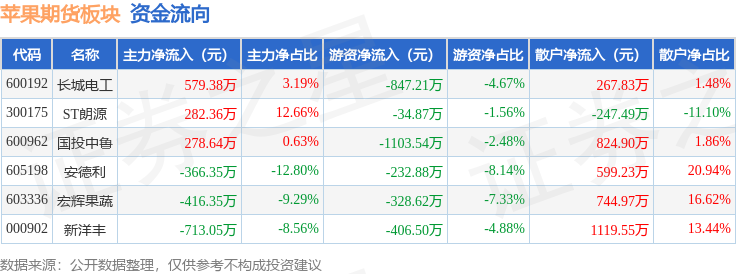 从资金流向上来看,当日苹果期货板块主力资金净流出355.37万元,游资资金净流出2953.62万元,散户资金净流入3308.99万元。苹果期货板块个股资金流向见下表: