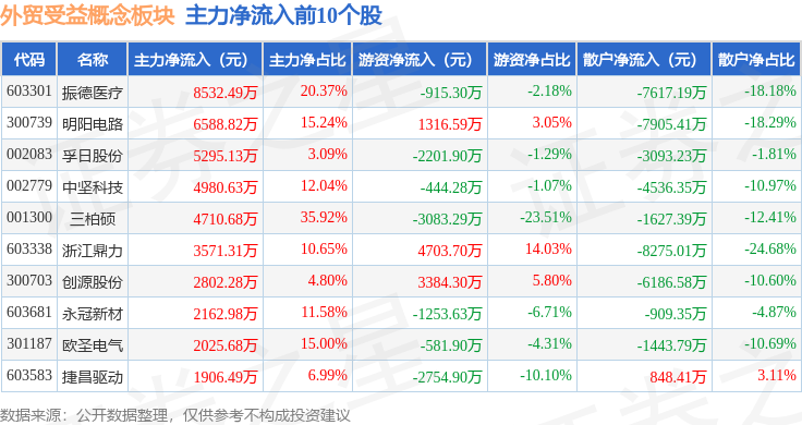 从资金流向上来看,当日外贸受益概念板块主力资金净流出5.76亿元,游资资金净流入9232.21万元,散户资金净流入4.83亿元。外贸受益概念板块个股资金流向见下表: