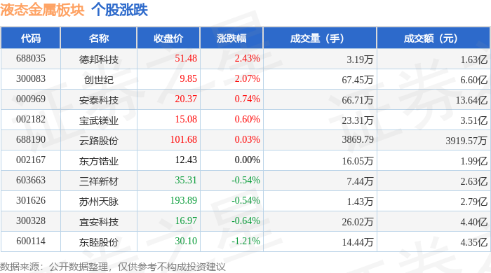 证券之星消息,12月25日液态金属板块较上一交易日上涨0.2%,德邦科技领涨。当日上证指数报收于3959.62,上涨0.47%。深证成指报收于13531.41,上涨0.33%。液态金属板块个股涨跌见下表: