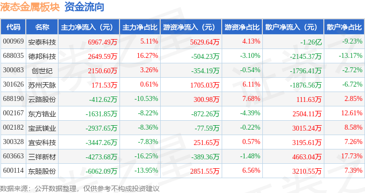 从资金流向上来看,当日液态金属板块主力资金净流出6825.93万元,游资资金净流入8541.22万元,散户资金净流出1715.29万元。液态金属板块个股资金流向见下表: