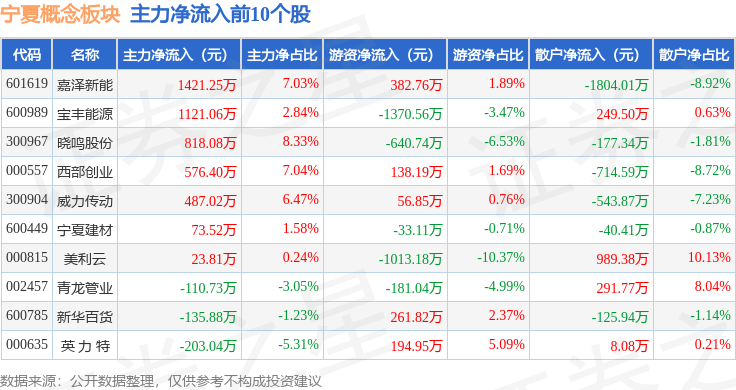 从资金流向上来看,当日宁夏概念板块主力资金净流出4186.11万元,游资资金净流入661.67万元,散户资金净流入3524.44万元。宁夏概念板块个股资金流向见下表: