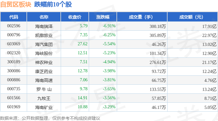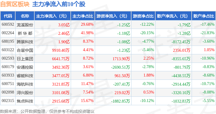 从资金流向上来看,当日自贸区板块主力资金净流出56.58亿元,游资资金净流入3.64亿元,散户资金净流入52.94亿元。自贸区板块个股资金流向见下表: