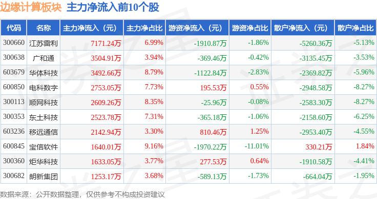 从资金流向上来看,当日边缘计算板块主力资金净流出14.03亿元,游资资金净流入1.81亿元,散户资金净流入12.22亿元。边缘计算板块个股资金流向见下表: