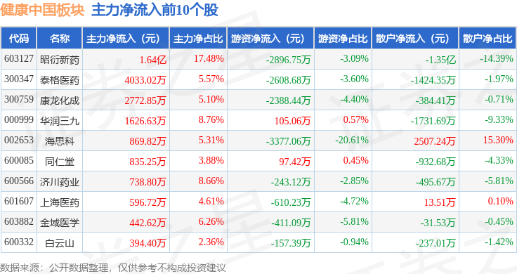从资金流向上来看,当日健康中国板块主力资金净流出9.36亿元,游资资金净流入6355.34万元,散户资金净流入8.73亿元。健康中国板块个股资金流向见下表: