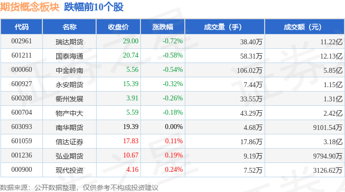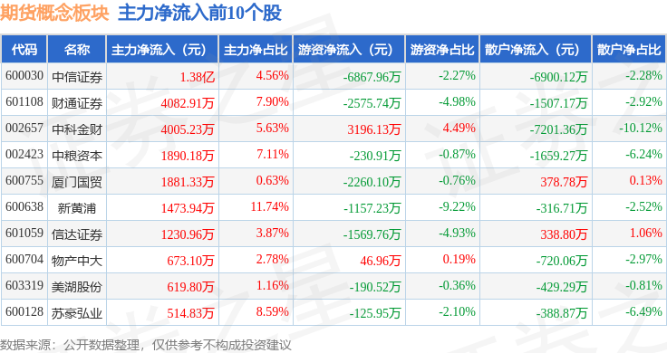从资金流向上来看,当日期货概念板块主力资金净流出4.95亿元,游资资金净流入6073.61万元,散户资金净流入4.34亿元。期货概念板块个股资金流向见下表: