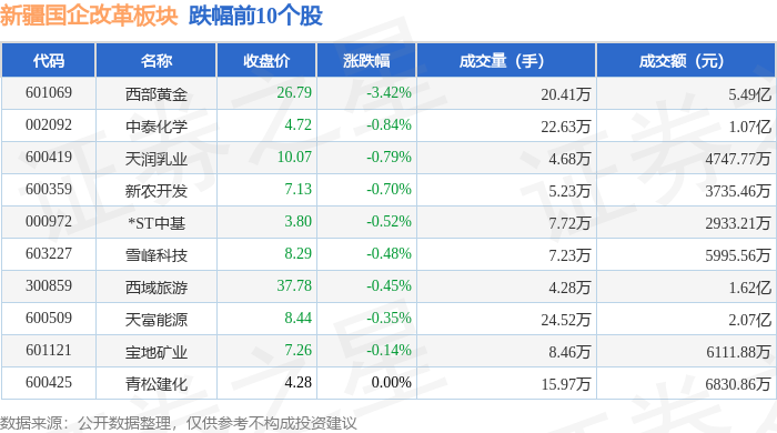 证券之星消息,12月25日新疆国企改革板块较上一交易日下跌0.41%,西部黄金领跌。当日上证指数报收于3959.62,上涨0.47%。深证成指报收于13531.41,上涨0.33%。新疆国企改革板块个股涨跌见下表: