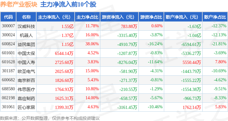 从资金流向上来看,当日养老产业板块主力资金净流出2.19亿元,游资资金净流出2.88亿元,散户资金净流入5.07亿元。养老产业板块个股资金流向见下表: