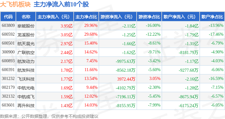 从资金流向上来看,当日大飞机板块主力资金净流入24.98亿元,游资资金净流出14.48亿元,散户资金净流出10.51亿元。大飞机板块个股资金流向见下表: