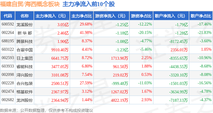 从资金流向上来看,当日福建自贸/海西概念板块主力资金净流出23.41亿元,游资资金净流入1.56亿元,散户资金净流入21.85亿元。福建自贸/海西概念板块个股资金流向见下表: