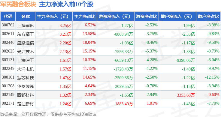 从资金流向上来看,当日军民融合板块主力资金净流入1.49亿元,游资资金净流出7.34亿元,散户资金净流入5.85亿元。军民融合板块个股资金流向见下表: