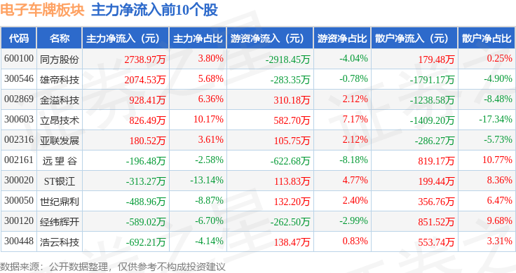从资金流向上来看,当日电子车牌板块主力资金净流出4885.23万元,游资资金净流出3031.38万元,散户资金净流入7916.61万元。电子车牌板块个股资金流向见下表: