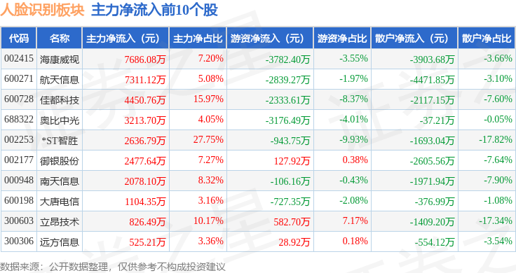从资金流向上来看,当日人脸识别板块主力资金净流出3.7亿元,游资资金净流出3523.07万元,散户资金净流入4.05亿元。人脸识别板块个股资金流向见下表: