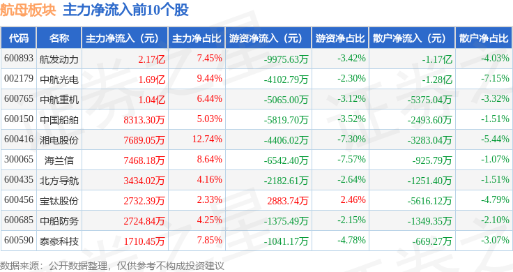从资金流向上来看,当日航母板块主力资金净流入1.83亿元,游资资金净流出4.98亿元,散户资金净流入3.15亿元。航母板块个股资金流向见下表: