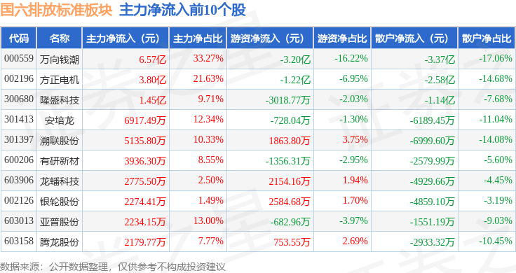 从资金流向上来看,当日国六排放标准板块主力资金净流入12.3亿元,游资资金净流出4.56亿元,散户资金净流出7.74亿元。国六排放标准板块个股资金流向见下表:
