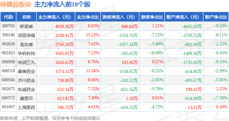 从资金流向上来看,当日保健品板块主力资金净流出2.9亿元,游资资金净流出7407.11万元,散户资金净流入3.64亿元。保健品板块个股资金流向见下表: