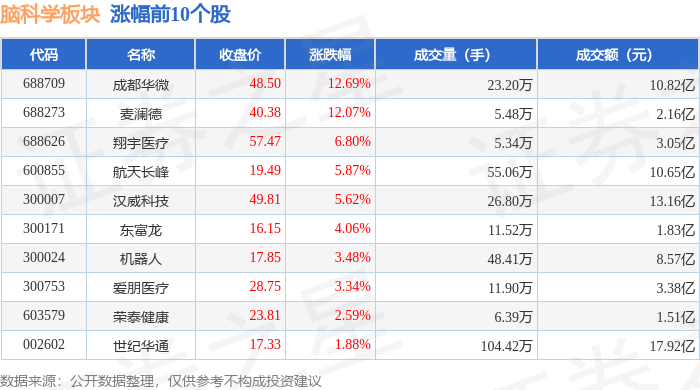 证券之星消息,12月25日脑科学板块较上一交易日上涨0.24%,成都华微领涨。当日上证指数报收于3959.62,上涨0.47%。深证成指报收于13531.41,上涨0.33%。脑科学板块个股涨跌见下表: