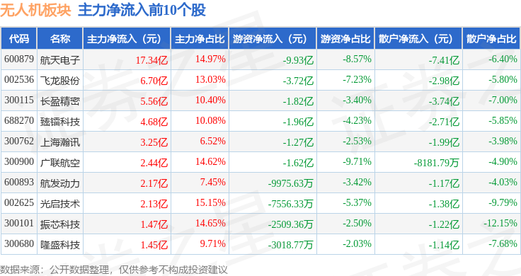从资金流向上来看,当日无人机板块主力资金净流入26.48亿元,游资资金净流出17.79亿元,散户资金净流出8.69亿元。无人机板块个股资金流向见下表:
