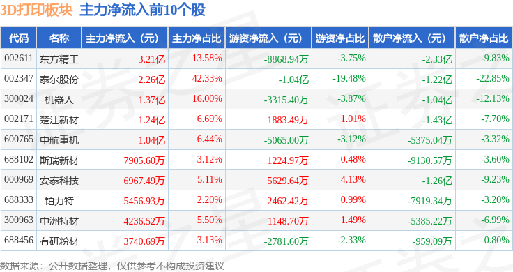 从资金流向上来看,当日3D打印板块主力资金净流入6.2亿元,游资资金净流出945.55万元,散户资金净流出6.1亿元。3D打印板块个股资金流向见下表: