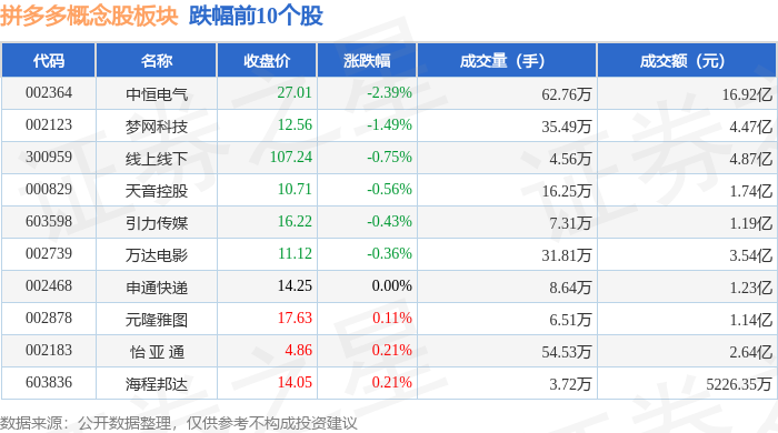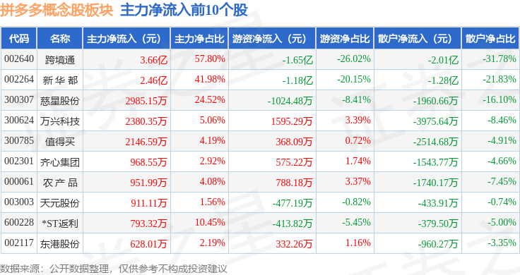 从资金流向上来看,当日拼多多概念股板块主力资金净流入2.13亿元,游资资金净流出2.16亿元,散户资金净流入344.54万元。拼多多概念股板块个股资金流向见下表: