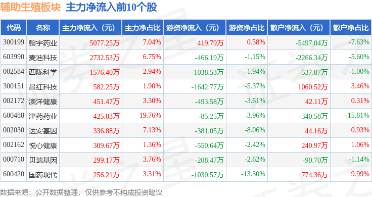 从资金流向上来看,当日辅助生殖板块主力资金净流出1.61亿元,游资资金净流出4020.54万元,散户资金净流入2.01亿元。辅助生殖板块个股资金流向见下表: