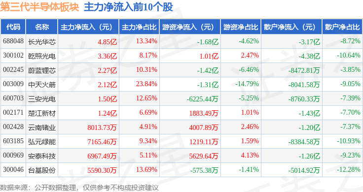 从资金流向上来看,当日第三代半导体板块主力资金净流出37.72亿元,游资资金净流入7.36亿元,散户资金净流入30.36亿元。第三代半导体板块个股资金流向见下表: