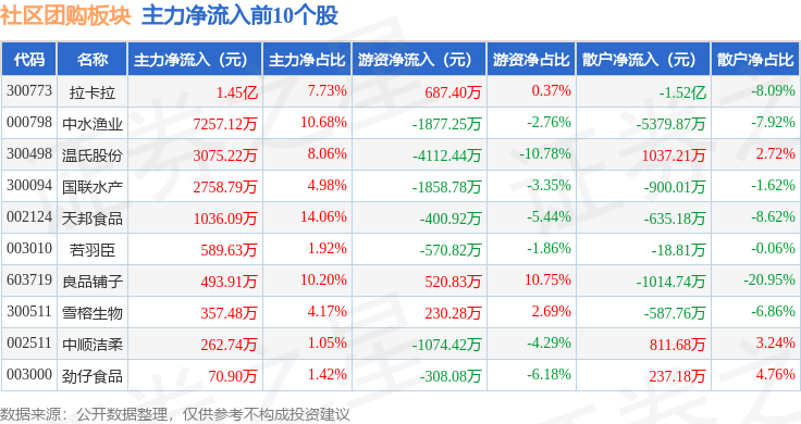 从资金流向上来看,当日社区团购板块主力资金净流出9.29亿元,游资资金净流出1.79亿元,散户资金净流入11.08亿元。社区团购板块个股资金流向见下表: