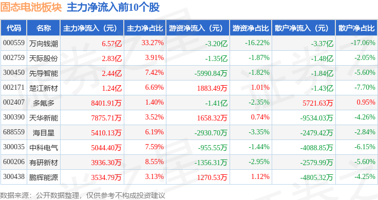 从资金流向上来看,当日固态电池板块主力资金净流出26.87亿元,游资资金净流出2.2亿元,散户资金净流入29.07亿元。固态电池板块个股资金流向见下表: