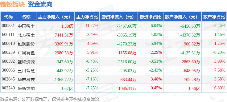 从资金流向上来看,当日镨钕板块主力资金净流入8835.46万元,游资资金净流出1.46亿元,散户资金净流入5794.96万元。镨钕板块个股资金流向见下表: