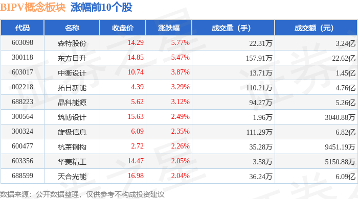 从资金流向上来看,当日BIPV概念板块主力资金净流出4577.79万元,游资资金净流出1.62亿元,散户资金净流入2.07亿元。BIPV概念板块个股资金流向见下表: