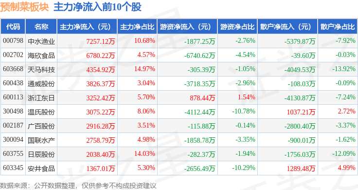 从资金流向上来看,当日预制菜板块主力资金净流入213.79万元,游资资金净流出2.04亿元,散户资金净流入2.02亿元。预制菜板块个股资金流向见下表: