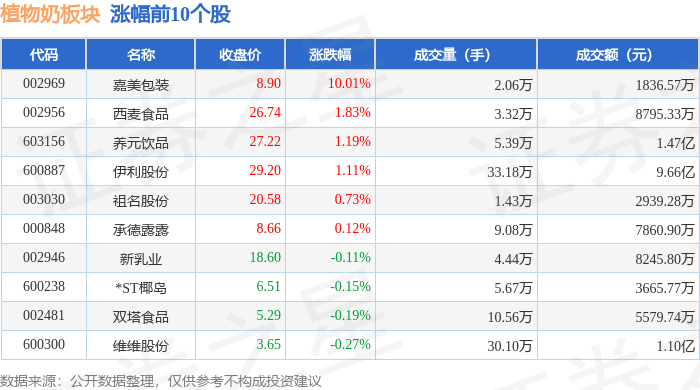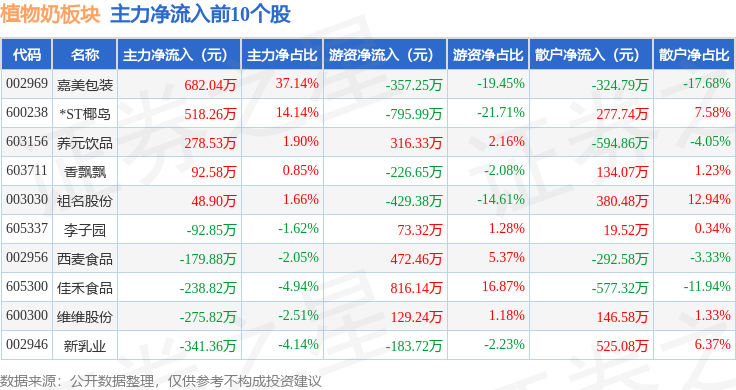 从资金流向上来看,当日植物奶板块主力资金净流出1.11亿元,游资资金净流入5803.15万元,散户资金净流入5341.47万元。植物奶板块个股资金流向见下表:
