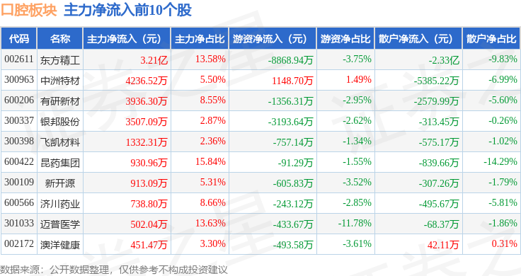 从资金流向上来看,当日口腔板块主力资金净流入4013.57万元,游资资金净流出1.41亿元,散户资金净流入1.01亿元。口腔板块个股资金流向见下表: