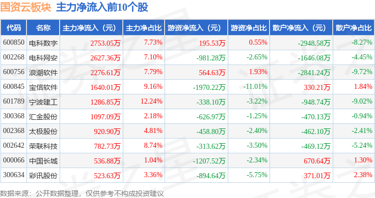 从资金流向上来看,当日国资云板块主力资金净流出14.76亿元,游资资金净流入2.39亿元,散户资金净流入12.37亿元。国资云板块个股资金流向见下表: