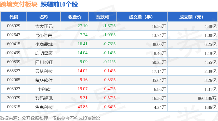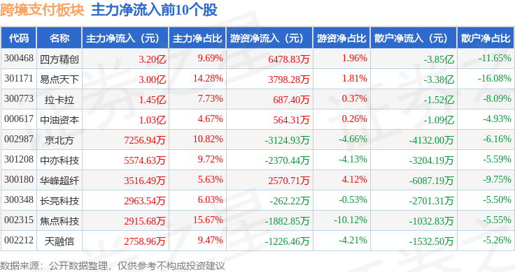 从资金流向上来看,当日跨境支付板块主力资金净流入6.5亿元,游资资金净流入8950.05万元,散户资金净流出7.4亿元。跨境支付板块个股资金流向见下表: